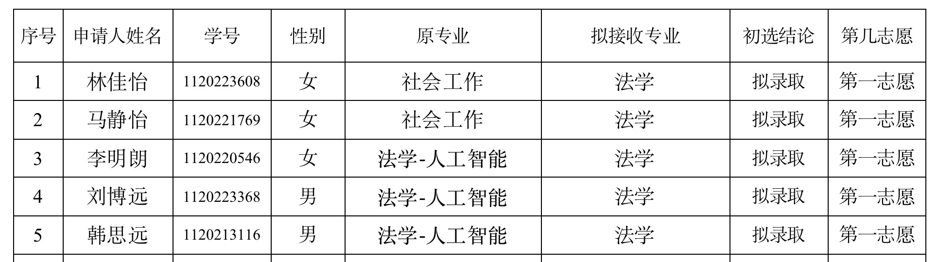 法学院2023-2024学年第一学期转专业初选结果公示