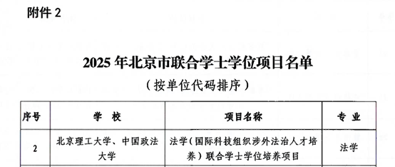 近日,北京市学位委员会公布了《北京市学位委员会关于公布2025年度双学士学位复合型人才培养项目及联合学士学位项目名单的通知》,批准北京理工大学与中国政法大学“法学(国际科技组织涉外法治人才培养)”联合学士学位培养项目。