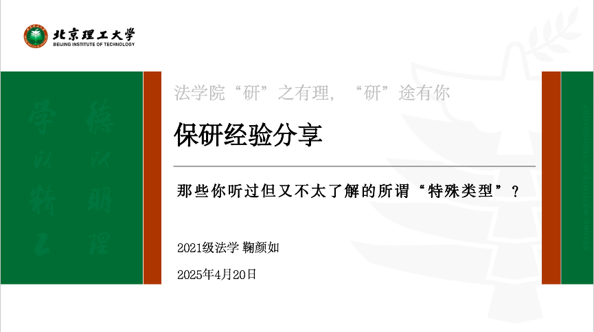 来自法学-人工智能双学位班、保研至北京理工大学法学院的李玥欣同学,分享了极具特色的个人保研经验。她鼓励同学们永不言弃,深入研究保研政策,还详细介绍了自己在保研择校、确定专业时的考量因素,以及保研准备和面试过程中的宝贵经验,让同学们对本校保研有了更深入的了解。