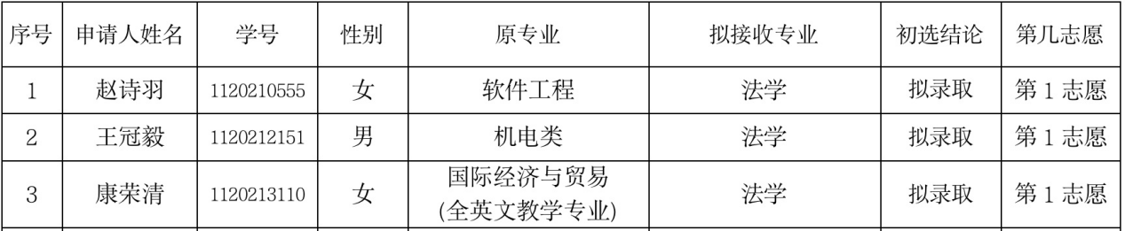 根据《北京理工大学本科生管理规定》、《北京理工大学本科生学籍管理细则》和教务部关于2022-2023学年第二学期转专业安排的相关规定,法学院严格按照上述文件规定,对提交转专业申请的同学进行资料审核,我院拟接收3名转专业学生,现对初选结果进行公示:
