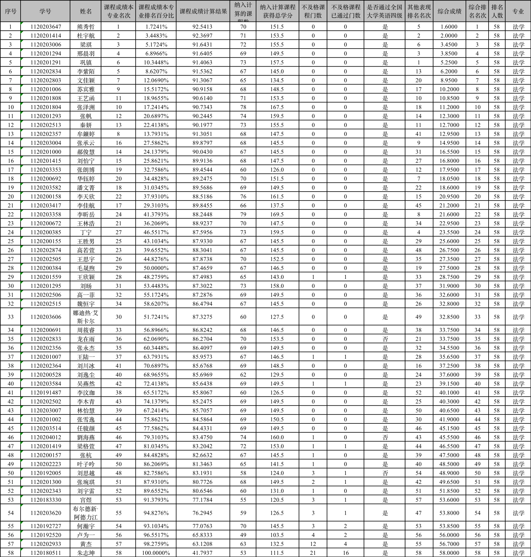 根据《北京理工大学法学院2024年推荐免试攻读硕士研究生工作实施细则》、《法学院2024年推荐优秀应届本科毕业生免试攻读研究生课程成绩计算细则》,现对综合成绩计算结果进行公示: