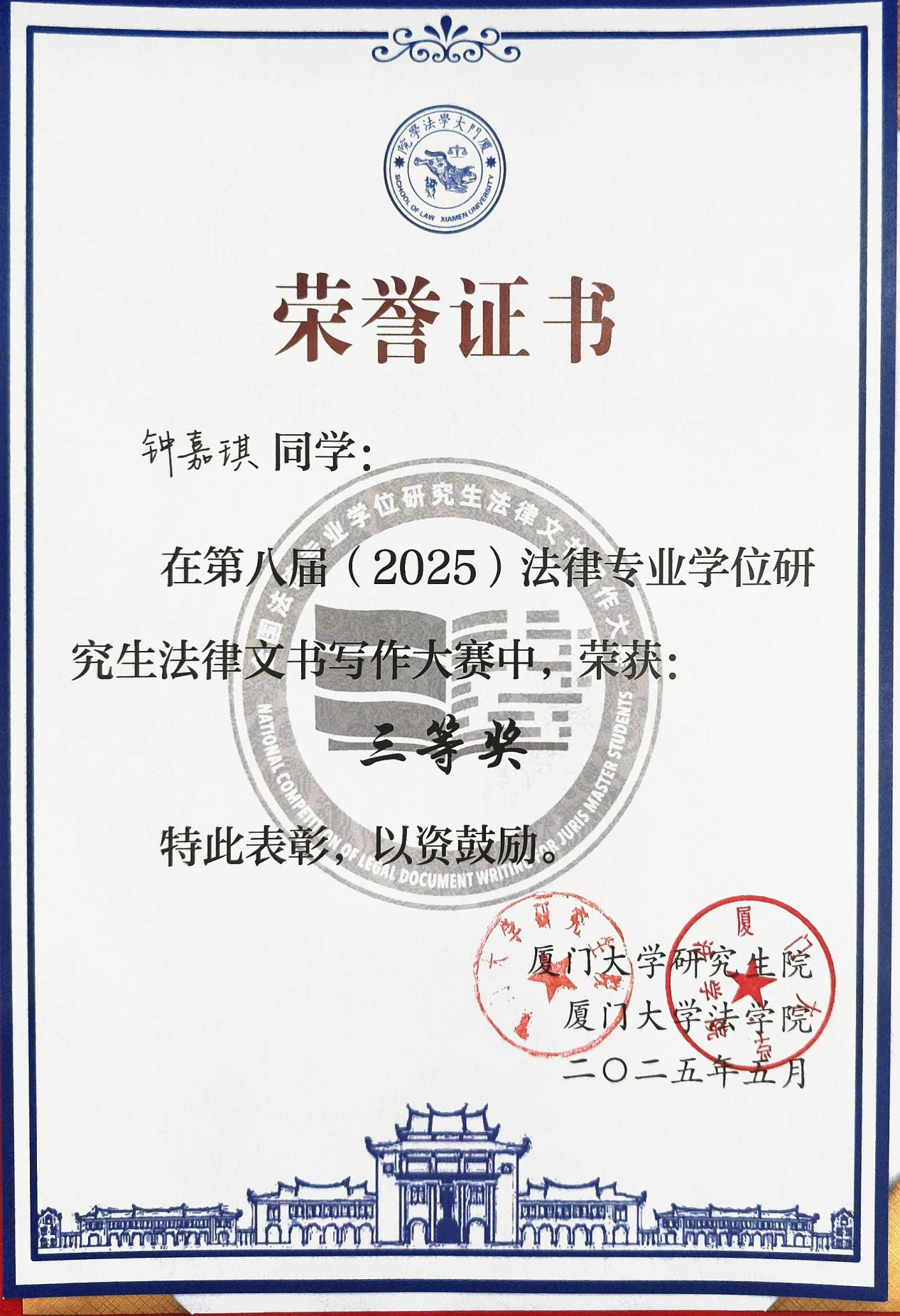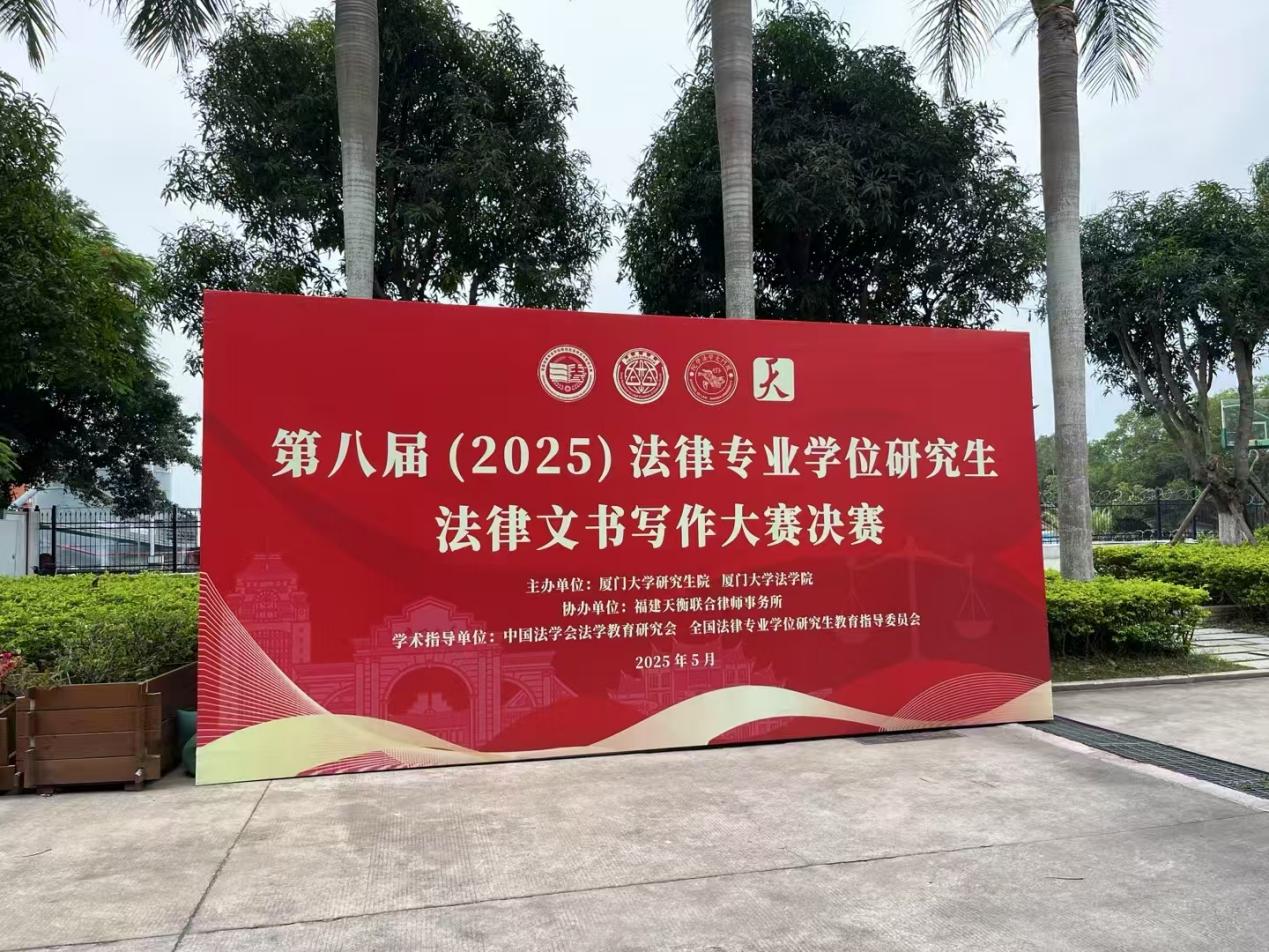 2025年5月25日,由中国法学会法学教育研究会、全国法律专业学位研究生教育指导委员会作为学术指导单位,厦门大学研究生院与厦门大学法学院主办的第八届(2025)法律专业学位研究生法律文书写作大赛圆满落幕。我院2024级法律硕士钟嘉琪荣获三等奖。